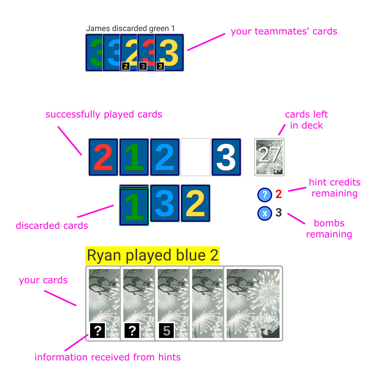 Fireworks is a collaborative, turn-based card game that you play with 1-4 other players on the internet. In Fireworks everyone can see the cards in your hand except for you, and you have to rely on hints from others plays to understand which cards are which.